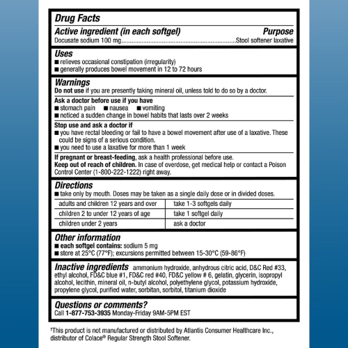 Docusate Sodium 100 mg: Giúp làm mềm phân và cải thiện tình trạng táo bón một cách nhẹ nhàng.