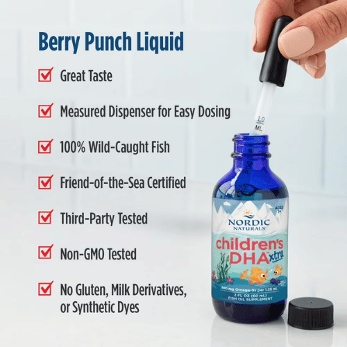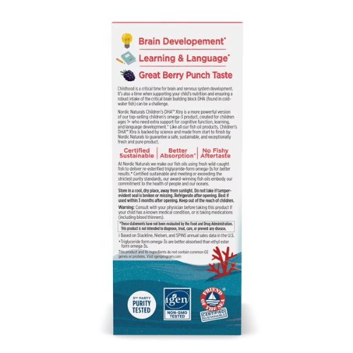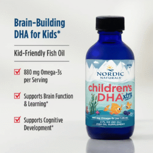 Dầu cá Nordic Naturals Children’s DHA Xtra là sản phẩm bổ sung Omega-3 hàm lượng cao dành cho trẻ nhỏ, cung cấp tỷ lệ DHA:EPA lý tưởng 2:1 giúp hỗ trợ phát triển trí não, thị giác và hệ thần kinh. Mỗi liều dùng cung cấp đến 800mg Omega-3, trong đó có 535mg DHA và 225mg EPA, giúp tăng cường chức năng nhận thức và miễn dịch cho trẻ trong giai đoạn phát triển quan trọng. Dạng lỏng dễ uống, hương berry thơm ngon, có thể pha vào thức ăn hoặc đồ uống, phù hợp cho trẻ từ 1–6 tuổi.