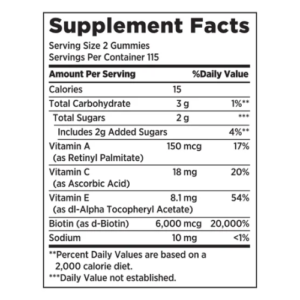 Công thức nâng cấp chứa 6,000 mcg biotin, cao gấp 2 lần so với dòng gummies tiêu chuẩn, giúp hỗ trợ hình thành keratin – thành phần quan trọng cấu tạo nên tóc và móng. Kết hợp cùng Vitamin A, Vitamin C và Vitamin E, sản phẩm giúp hỗ trợ quá trình sản sinh collagen, nuôi dưỡng làn da khỏe mạnh, tăng độ đàn hồi và chống oxy hóa, giúp bảo vệ tế bào trước tác động môi trường.
