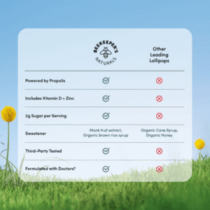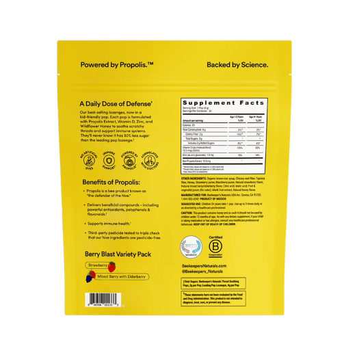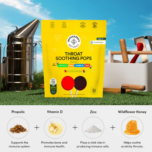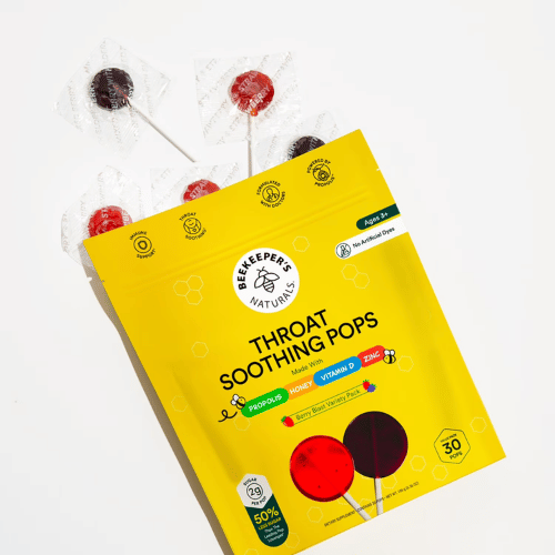 Kẹo mút keo ong BEEKEEPER’S NATURALS giúp làm dịu cổ họng, hỗ trợ miễn dịch, ít đường, vị ngon dễ dùng cho trẻ.