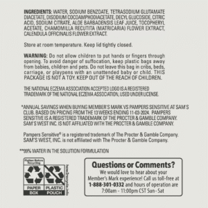 Member’s Mark Premium Baby Wipes là dòng khăn ướt cao cấp dành cho trẻ nhỏ, được thiết kế đặc biệt để chăm sóc làn da nhạy cảm. Với thành phần chứa 99% nước và dưới 1% các dưỡng chất thiết yếu, sản phẩm giúp làm sạch nhẹ nhàng mà vẫn giữ được độ ẩm tự nhiên cho da bé.