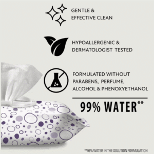 Sản phẩm đã được kiểm nghiệm da liễu, không gây dị ứng và được Hiệp hội Eczema Hoa Kỳ chứng nhận an toàn cho da nhạy cảm. Thiết kế nắp mở tiện lợi giúp lấy khăn bằng một tay và giữ độ ẩm tốt trong suốt quá trình sử dụng.