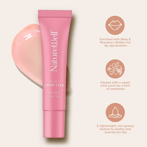 Son dưỡng có màu NatureWell Pink Velvet Tinted Lip Butter giúp môi căng mọng với độ ẩm, độ bóng và sắc hồng nhẹ tự nhiên. Công thức giàu Vitamin E, bơ hạt mỡ (Shea Butter) và bơ Murumuru giúp dưỡng ẩm sâu, làm dịu môi khô nứt và cải thiện độ mềm mịn.