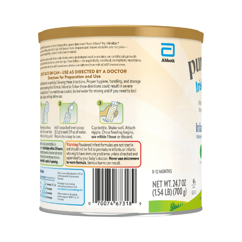 Sữa bột Pure Bliss by Similac Irish Farms là dòng sữa cao cấp được sản xuất tại châu Âu, sử dụng nguồn sữa tươi từ bò nuôi tại Ireland. Công thức được thiết kế gần giống với sữa mẹ, mang lại nguồn dinh dưỡng tự nhiên, dễ tiêu hóa và hỗ trợ sự phát triển toàn diện cho trẻ trong những năm đầu đời.