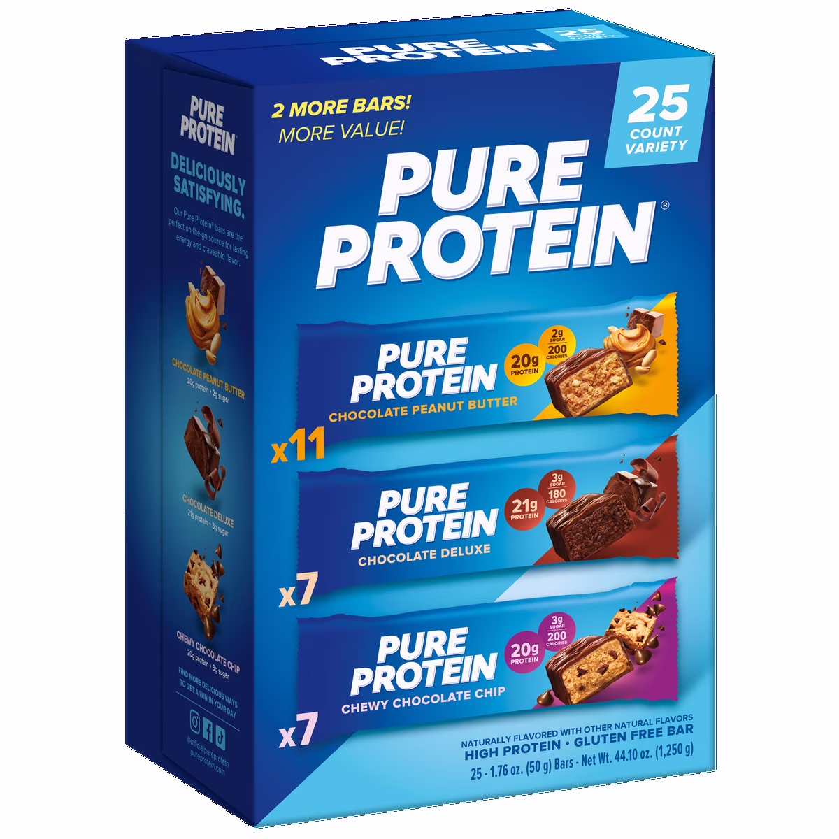 Thanh protein Pure Protein gồm 25 thanh với 3 hương vị hấp dẫn: Chocolate Peanut Butter, Chocolate Deluxe và Chewy Chocolate Chip. Mỗi thanh nhỏ gọn 1.76 oz, tiện lợi mang theo và sử dụng mọi lúc. Đây là lựa chọn lý tưởng cho bữa ăn nhẹ nhanh chóng và tiện dụng.