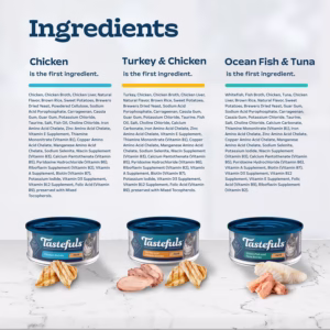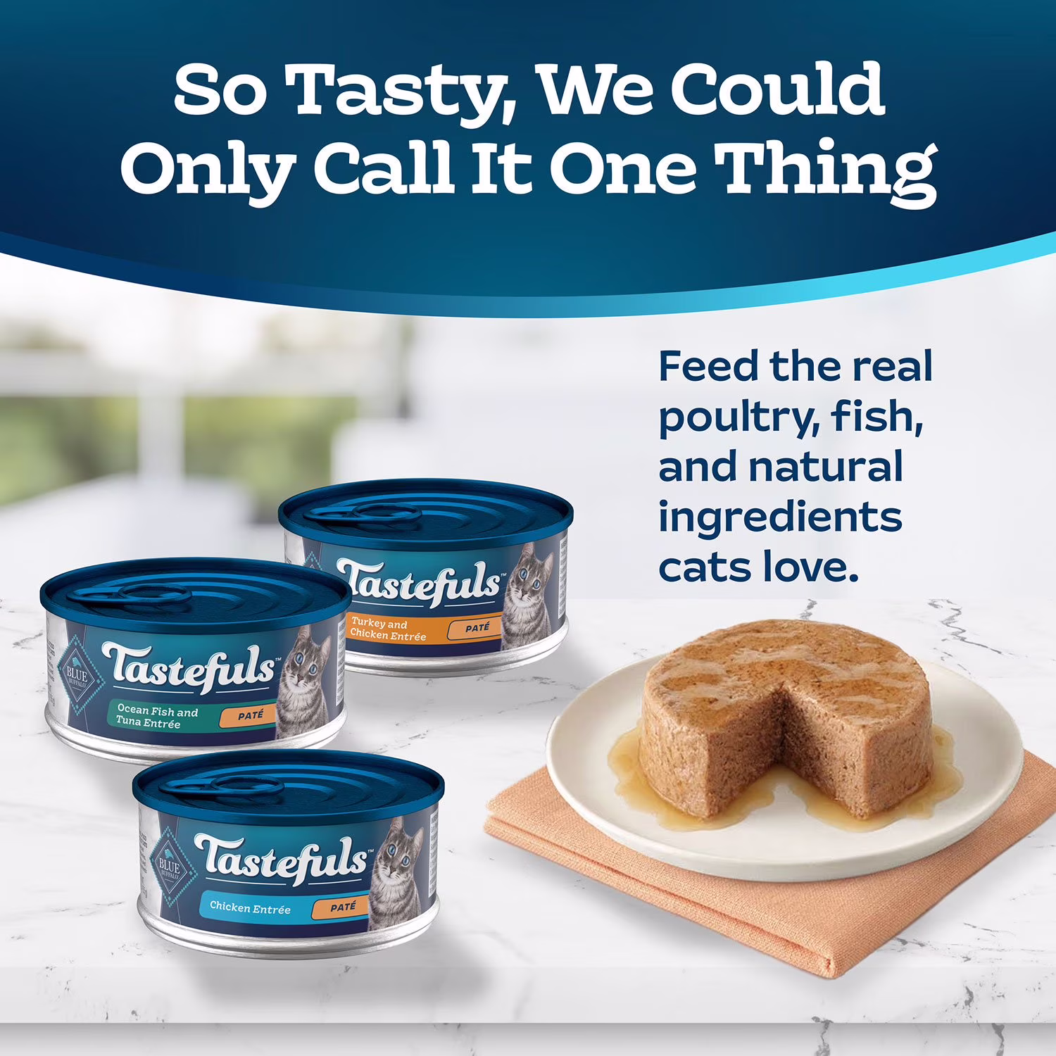 Gói sản phẩm BLUE Tastefuls mang đến cho mèo của bạn bộ 3 hương vị pate mềm mịn hấp dẫn, được chế biến từ các nguồn protein chất lượng cao như: