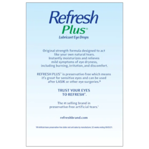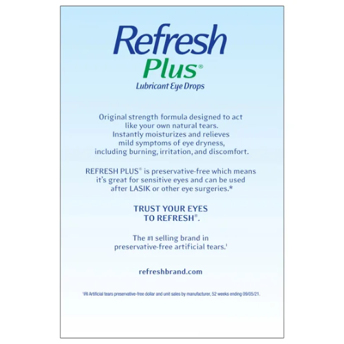 Thuốc nhỏ mắt Refresh Plus giúp cung cấp độ ẩm tức thì và làm dịu nhanh các triệu chứng nhẹ của mắt khô như rát, kích ứng, khó chịu và mỏi mắt. Công thức được thiết kế theo dạng “nước mắt nhân tạo” giúp bôi trơn và giữ ẩm tự nhiên cho mắt, mang lại cảm giác dễ chịu ngay sau khi sử dụng.