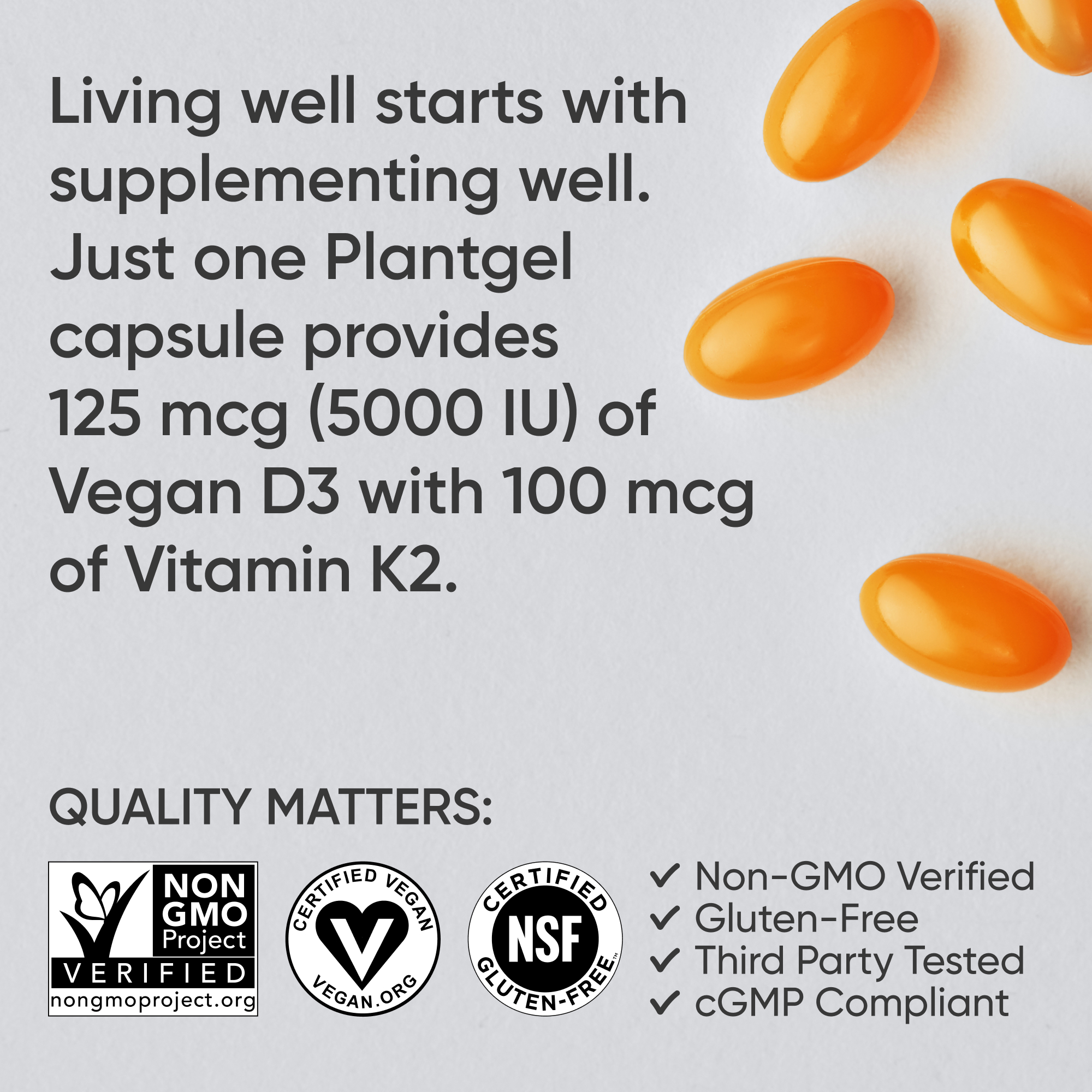 - 125mcg (5000 IU) Vitamin D3 (dưới dạng Cholecalciferol) (VegaDELight™ chiết xuất từ địa y)