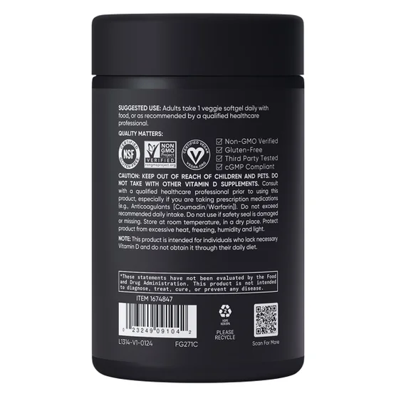 Cảnh báo: Để xa tầm tay trẻ em và vật nuôi. Không sử dụng chung với các thực phẩm bổ sung vitamin D liều cao khác. Sản phẩm này dành cho những người không nhận đủ lượng vitamin D cần thiết hàng ngày thông qua chế độ ăn uống. Tham khảo ý kiến chuyên gia chăm sóc sức khỏe trước khi sử dụng sản phẩm này, đặc biệt nếu bạn đang mang thai, cho con bú, có bệnh lý hoặc đang dùng thuốc theo toa (ví dụ: thuốc chống đông máu [Coumadin/Warfarin]). Không vượt quá liều lượng khuyến cáo hàng ngày. Không sử dụng nếu niêm phong an toàn bị hỏng hoặc mất. Bảo quản ở nhiệt độ phòng, nơi khô ráo. Tránh nhiệt độ quá cao, đông lạnh, độ ẩm và ánh sáng.
