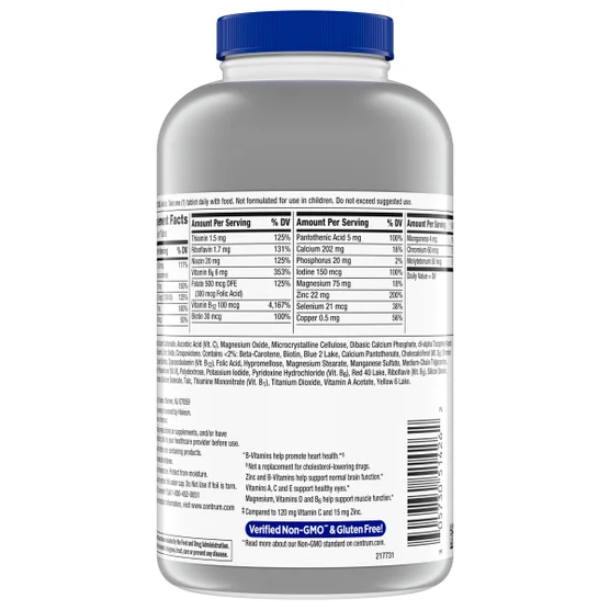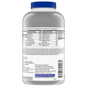 Thành phần: Canxi cacbonat, Kali clorua, Axit ascorbic (Vitamin C), Magie oxit, Cellulose vi tinh thể, Canxi photphat dibasic, DL-alpha tocopheryl axetat (Vitamin E), Maltodextrin, Crospovidone, Kẽm oxit. Chứa <2%: Beta-Carotene, Biotin, Blue 2 Lake, Calcium Pantothenate (Vitamin B5), Cholecalciferol (Vitamin D3), Chromium Picolinate, Copper Sulfate, Cyanocobalamin (Vitamin B12), Folic Acid, Hypromellose, Magnesium Stearate, Manganese Sulfate, Medium-Chain Triglycerides, Niacinamide, Phytonadione (Vitamin K), Polydextrose, Potassium Iodide, Pyridoxine Hydrochloride (Vitamin B6), Red 40 Lake, Riboflavin (Vitamin B2), Silicon Dioxide, Sodium Molybdate, Sodium Selenate, Talc, Thiamine Mononitrate (Vitamin B1), Titanium Dioxide, Vitamin A Acetate, Yellow 6 Lake. Cảnh