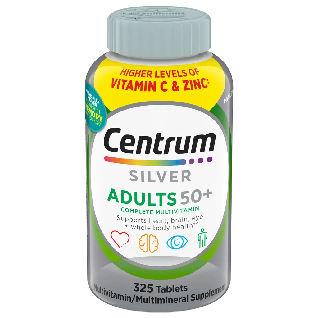 - Chai 325 viên Centrum Silver Multivitamin dành cho người lớn trên 50 tuổi với hàm lượng cao hơn các thành phần hỗ trợ miễn dịch, thực phẩm bổ sung đa vitamin/đa khoáng chất hoàn chỉnh dành cho người lớn trên 50 tuổi .