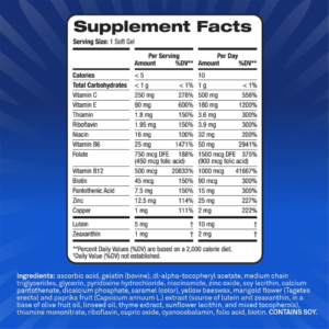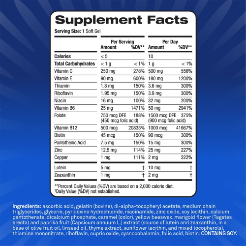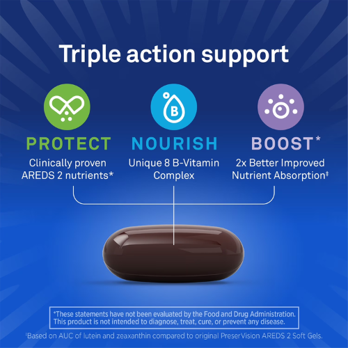 Công thức ba tác động (Triple-Action) kết hợp phức hợp 8 vitamin nhóm B cùng với các dưỡng chất AREDS2 đã được chứng minh lâm sàng và khuyến nghị bởi Viện Mắt Quốc gia Hoa Kỳ (NEI). Sự kết hợp này giúp hỗ trợ giảm nguy cơ tiến triển thoái hóa điểm vàng (AMD) giai đoạn trung bình đến nặng.*