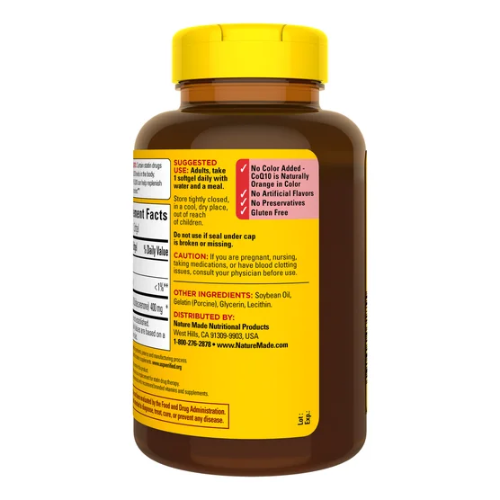 Nature Made CoQ10 400 mg là thực phẩm bổ sung cung cấp 400 mg Coenzyme Q10 (CoQ10) trong mỗi viên nang mềm. Đây là một hợp chất tan trong chất béo, hiện diện trong hầu hết các tế bào cơ thể, giữ vai trò quan trọng trong việc hỗ trợ sức khỏe tim mạch và tham gia vào quá trình tạo năng lượng cho tế bào. Ngoài ra, sản phẩm còn có tác dụng chống oxy hóa, giúp bảo vệ tế bào trước tác động của stress oxy hóa.
